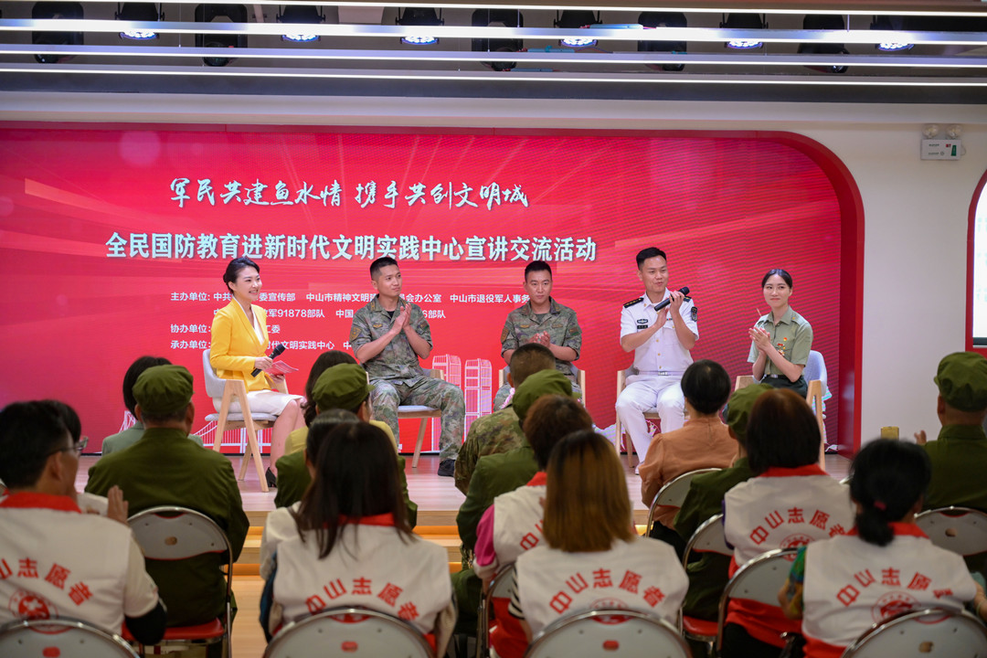5月18日下午,全民國防教育進新時代文明實踐中心宣講交流活動在中山市民眾街道新時代文明實踐中心舉行,退役軍人代表、基層群眾、村干部以及受邀出席的中國人民解放軍91878部隊、69316部隊官兵代表等200余人參加活動。