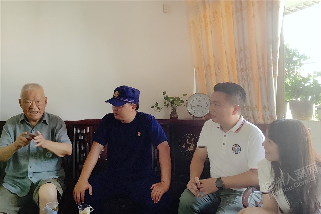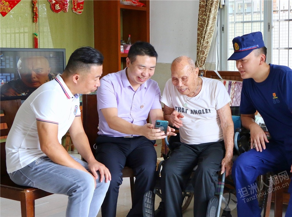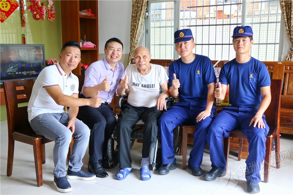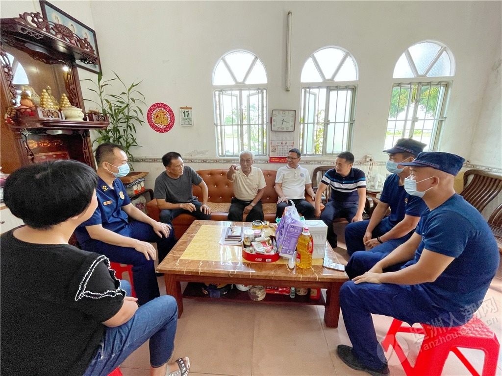 隨后,慰問組還邀請(qǐng)參戰(zhàn)老兵鄭金洪走進(jìn)中山市消防救援支隊(duì)坦洲大隊(duì)講述革命故事,給與會(huì)黨員干部和部分基干民兵送上了一堂生動(dòng)、鮮活的紅色教育黨課,讓全體人員感受參戰(zhàn)老兵的精神洗禮?!霸谝淮尾筷?duì)作戰(zhàn)時(shí),我和另一名貴州籍的戰(zhàn)友去攻打一個(gè)火力點(diǎn),我們一起在山腳的一塊石頭處掩護(hù),但根據(jù)我以往的作戰(zhàn)經(jīng)驗(yàn),我覺得這里不安全,于是趕緊對(duì)他說不要待在那塊石頭那,也不要站立,趕緊滾到下面的公路去;好在他聽從我的命令后,迅速地做出反應(yīng)。當(dāng)我們到達(dá)安全地方時(shí),長(zhǎng)舒一口氣,一直聽到有子彈嗖嗖嗖地從那塊石頭附近穿梭而過;而那位戰(zhàn)友感慨地跟我說‘班長(zhǎng),好在你迅速做出反應(yīng),不然我在那不是受傷就是死了。”鄭金洪以親身經(jīng)歷聲情并茂地向大家講述了當(dāng)年戰(zhàn)火紛飛的戰(zhàn)斗經(jīng)歷。 ▲慰問組一行聆聽烈士遺屬陳北根講述他父親生前與敵斗爭(zhēng)的英雄故事。