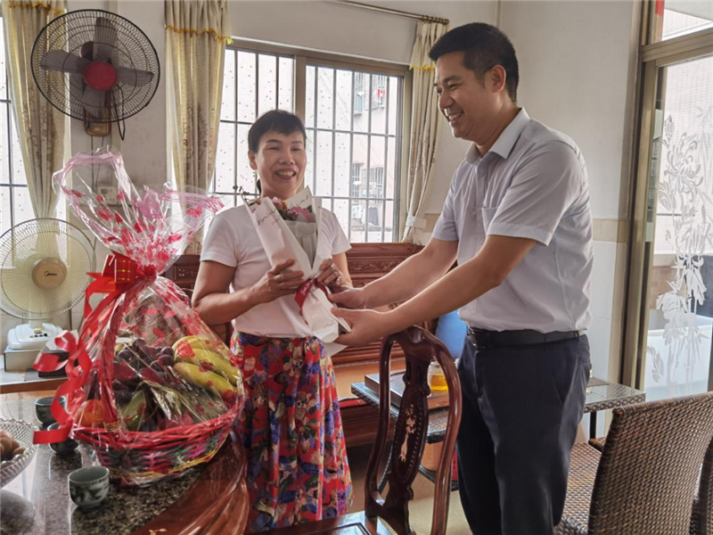 每到一戶,南頭鎮(zhèn)退役軍人服務(wù)中心主任黃國全都為“兵媽媽”獻(xiàn)上鮮花和果籃,并了解邊防海防現(xiàn)役軍人在部隊的服役情況,以及家屬身體狀況、生活、工作等情況,對她們默默支持孩子為國防建設(shè)作貢獻(xiàn)致以崇高的敬意。