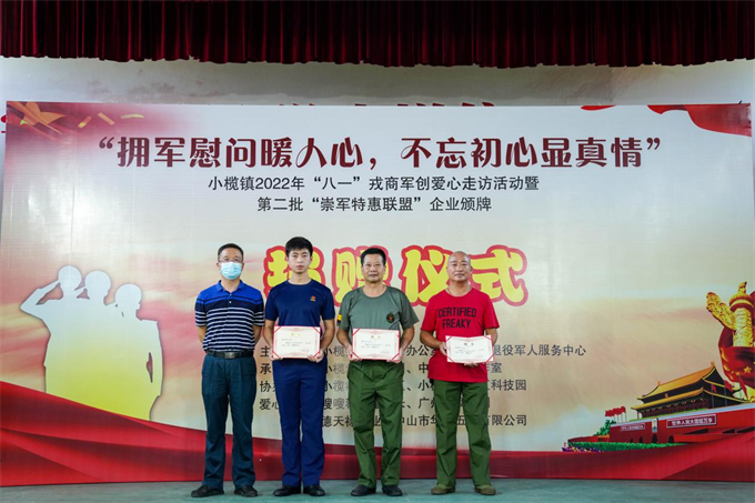 7月24日,小欖鎮(zhèn)舉行“擁軍慰問暖人心,不忘初心顯真情”——2022年“八一”愛心走訪活動(dòng)啟動(dòng)暨第二批“崇軍特惠聯(lián)盟”企業(yè)頒牌儀式。該鎮(zhèn)副鎮(zhèn)長(zhǎng)鄧泳標(biāo)、市退役軍人服務(wù)中心副主任高亞男及鎮(zhèn)公共服務(wù)辦、退役軍人服務(wù)中心、高沙社區(qū)、中山好人工作室相關(guān)負(fù)責(zé)人,小欖愛心助學(xué)團(tuán)志愿者、愛心企業(yè)及第二批市“崇軍特惠聯(lián)盟”企業(yè)的代表以及部分優(yōu)秀退役軍人代表近100人參加了活動(dòng)。