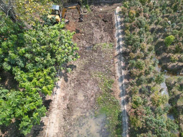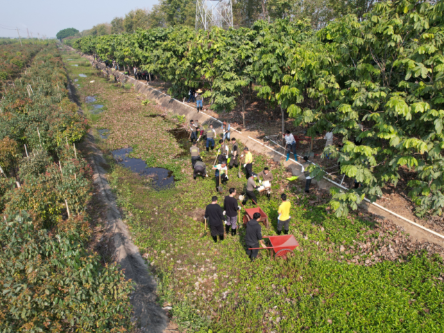 為提高清淤工作效率,結合木圍排灌渠兩側岸坡均已密植花木實際情況,本次活動采取了“挖機+人工”的清淤方式,由挖掘機將排灌渠內雜草、淤泥集中清理堆至渠外空地,再由人工精細作業(yè),轉運淤泥雜草至花木間區(qū)域平鋪晾曬改良土壤、增強肥力。