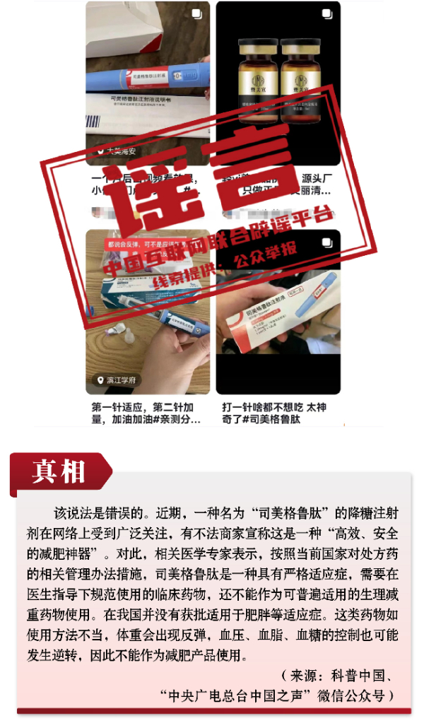 有關(guān)呼吸道疾病防治的謠言和誤區(qū)誤導(dǎo)公眾。隨著各地陸續(xù)入冬,呼吸道疾病進(jìn)入高發(fā)季節(jié),多種呼吸道疾病交織疊加,難免讓人焦慮。恰在此時(shí),網(wǎng)上一些治病養(yǎng)生醫(yī)藥“偏方”頻出,一些自媒體假借專業(yè)人士和醫(yī)生網(wǎng)上“開方”,真假難辨、誤導(dǎo)公眾。如“感染肺炎支原體會(huì)得肺炎、會(huì)出現(xiàn)‘白肺’”“可自行給孩子服用阿奇霉素等藥物以預(yù)防支原體肺炎”“可網(wǎng)上購買‘醫(yī)院同款’霧化器在家自療”等謠言,抓住人們對疾病的恐懼心理大肆傳播,有的耽誤正常治療,有的則是“假科普、真帶貨”。此外,“使用司美格魯肽能輕松減肥”的謠言,無視權(quán)威部門對處方藥的相關(guān)管理辦法措施,此類藥品若盲目使用或者使用不當(dāng),存在很大健康風(fēng)險(xiǎn)。