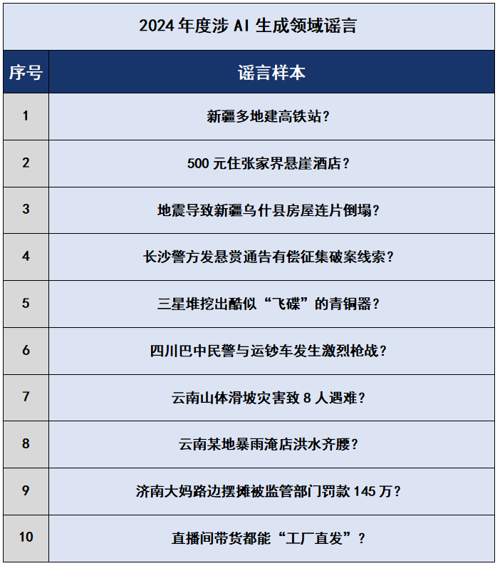 2024年初,“新疆多地建高鐵站”虛假短視頻在網(wǎng)上流傳,此類視頻由軟件智能合成,用戶只需使用指定視頻模板、手動(dòng)替換涉本人家鄉(xiāng)相關(guān)地點(diǎn)的文字即可生成新視頻,利用人們對(duì)家鄉(xiāng)基礎(chǔ)設(shè)施建設(shè)情況的關(guān)注而大肆傳播,誤導(dǎo)公眾。還有個(gè)別網(wǎng)民為獲取流量和不當(dāng)利益,利用AI軟件蓄意歪曲“交警請(qǐng)占道停留的運(yùn)鈔車駛離”的事實(shí),編造謠言“四川巴中民警與運(yùn)鈔車發(fā)生激烈槍戰(zhàn)”,造成公眾恐慌和誤解。此外,謠言“濟(jì)南大媽路邊擺攤被監(jiān)管部門罰款145萬”實(shí)為AI工具生成的虛假文章,大肆消費(fèi)公眾的同情心博取眼球,引發(fā)大范圍傳播,造成不良社會(huì)影響,相關(guān)違法人員被公安機(jī)關(guān)依法行政拘留?!霸颇仙襟w滑坡災(zāi)害致8人遇難”“地震導(dǎo)致新疆烏什縣房屋連片倒塌”“云南某地暴雨淹店洪水齊腰”等謠言則純屬子虛烏有,均為AI特效炮制的虛假視頻,利用公眾對(duì)災(zāi)難事件的重視編造傷亡情況,制造恐慌情緒,擾亂社會(huì)秩序。