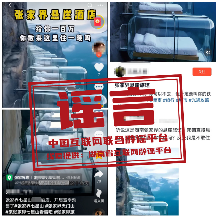 真相:近日,某短視頻平臺出現(xiàn)多條所謂“張家界懸崖酒店”的視頻,視頻顯示“幾張由玻璃罩著的床,整齊地排列在懸崖上”,文案稱“張家界懸崖旅館房費(fèi)一個(gè)晚上500元”。對此,經(jīng)媒體記者采訪核查,張家界文旅局及張家界國家森林公園景區(qū)工作人員均表示“不知道懸崖旅館”。同時(shí),記者問詢張家界多家酒店、客棧,均未找到視頻中的“懸崖酒店”。(來源:上游新聞)