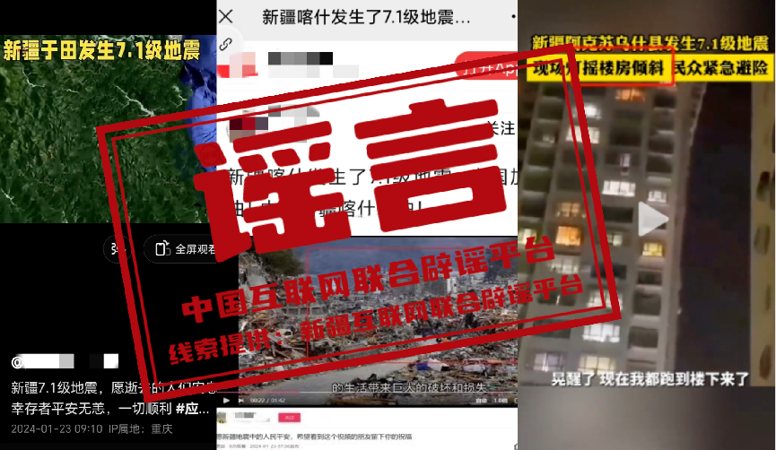 詳情:1月23日2時(shí)9分,新疆阿克蘇地區(qū)烏什縣發(fā)生7.1級地震。隨后,關(guān)于此次地震的各種不實(shí)信息在網(wǎng)絡(luò)上傳播,混淆視聽、引發(fā)關(guān)注。針對“新疆喀什發(fā)生7.1級地震”“新疆和田地區(qū)于田縣發(fā)生7.1級地震”的網(wǎng)傳信息,經(jīng)喀什市應(yīng)急管理局和于田縣應(yīng)急管理局證實(shí),1月23日兩地均未發(fā)生地震,信息為虛假不實(shí)內(nèi)容;針對“阿克蘇某小區(qū)樓被地震晃歪了”的圖文信息,經(jīng)相關(guān)部門核實(shí),圖片中的建筑物為阿克蘇市鳳凰城小區(qū)居民樓,排查暫未發(fā)現(xiàn)地震造成該樓體傾斜,網(wǎng)傳圖片系建筑物樓體設(shè)計(jì)和拍攝角度造成的樓體傾斜視覺錯(cuò)誤;針對上述圖片和視頻顯示的“烏什縣路面損毀嚴(yán)重、房屋連片倒塌”相關(guān)信息,經(jīng)查是網(wǎng)民利用AI自動(dòng)生成技術(shù),將烏什縣7.1級地震有關(guān)信息與網(wǎng)絡(luò)舊圖合成的虛假信息。中國互聯(lián)網(wǎng)聯(lián)合辟謠平臺(tái)提醒廣大網(wǎng)民,以官方發(fā)布信息為準(zhǔn),自覺抵制網(wǎng)絡(luò)謠言。(來源:“和田網(wǎng)絡(luò)舉報(bào)辟謠”微信公眾號、“喀什市零距離”微信公眾號、“阿克蘇網(wǎng)絡(luò)舉報(bào)”微信公眾號)