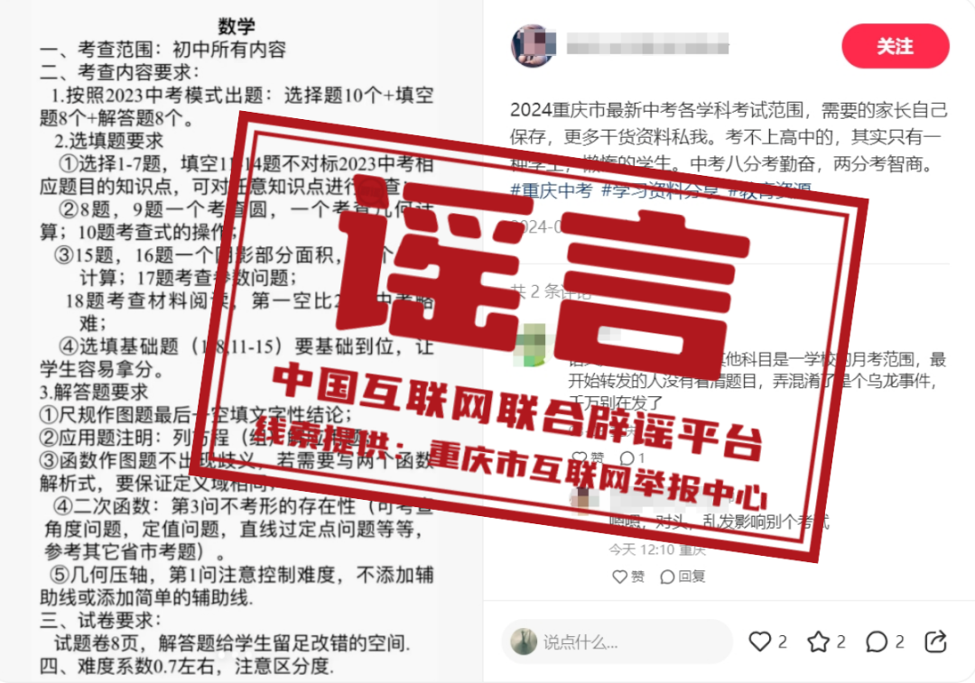真相:近日,有網(wǎng)民發(fā)布2024年重慶中考各學(xué)科“考查范圍、考查內(nèi)容要求、試卷要求和難度系數(shù)”等信息,引發(fā)關(guān)注。經(jīng)核實(shí),重慶市教育科學(xué)研究院有關(guān)研討會(huì)尚未召開,且會(huì)前未發(fā)布任何有關(guān)中考各學(xué)科命題信息。重慶市教育科學(xué)研究院表示,網(wǎng)上傳播的各學(xué)科“考查范圍、考查內(nèi)容要求、試卷要求和難度系數(shù)”等內(nèi)容均為虛假信息。(來源:重慶辟謠)