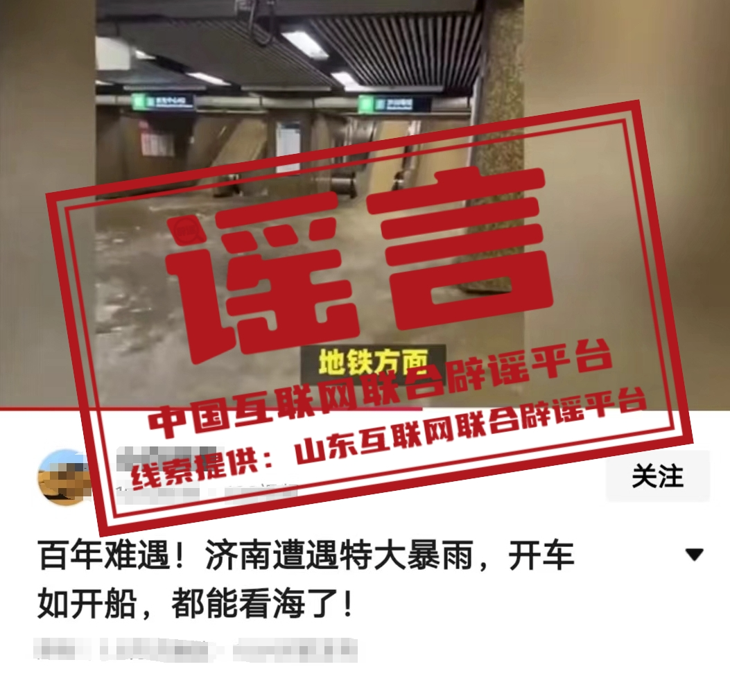 真相:7月22日,一則內(nèi)容為“百年難遇!濟(jì)南遭遇特大暴雨,開(kāi)車如開(kāi)船”的視頻信息在網(wǎng)絡(luò)傳播,視頻中還摻雜“車庫(kù)倒灌”“地鐵被淹”等水災(zāi)畫面。經(jīng)當(dāng)?shù)叵嚓P(guān)部門核實(shí),濟(jì)南市氣象臺(tái)于22日11時(shí)解除雷雨大風(fēng)黃色預(yù)警信號(hào),當(dāng)日并未出現(xiàn)特大降雨情況。視頻中的地鐵、街道等場(chǎng)景不在濟(jì)南。該視頻信息為謠言。(來(lái)源:山東互聯(lián)網(wǎng)聯(lián)合辟謠平臺(tái)、濟(jì)南互聯(lián)網(wǎng)聯(lián)合辟謠平臺(tái))