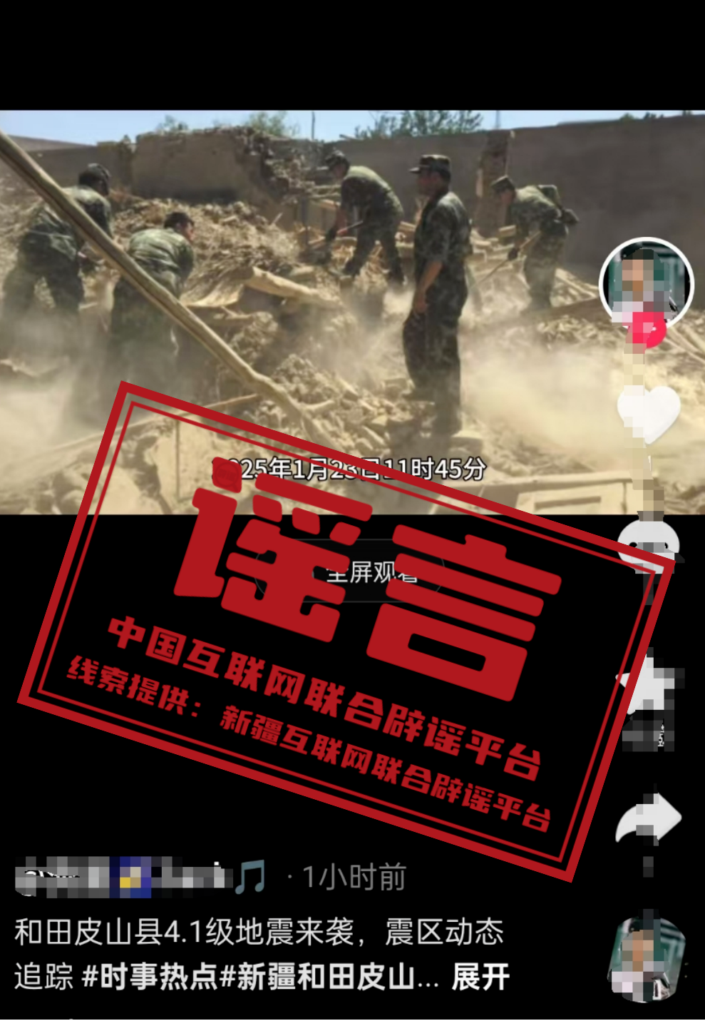 真相:中國地震臺網(wǎng)正式測定,2025年01月23日11時45分在新疆皮山縣(緯度36.94°,經(jīng)度78.87°)發(fā)生4.1級地震,震源深度15公里,震中附近地形類型為山地,5公里范圍內(nèi)平均海拔高度為2484米,距離皮山縣92公里。個別網(wǎng)民關(guān)聯(lián)此次地震,發(fā)布“房屋倒塌、道路坍塌及應急救援”等謠言圖片和短視頻,博取流量誤導網(wǎng)民。經(jīng)皮山縣應急管理局核實,此次地震未造成人員傷亡及財產(chǎn)損失。對編造散布地震謠言擾亂公共秩序、造成惡劣社會影響的行為,公安機關(guān)將依法依規(guī)嚴肅查處。請廣大網(wǎng)民擦亮眼睛,勿輕信傳播非正規(guī)來源、未經(jīng)證實的地震信息。(來源:新疆網(wǎng)絡辟謠)